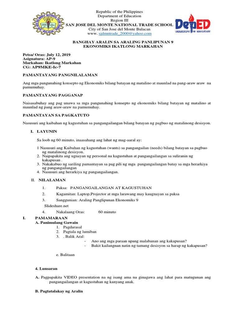 BANGHAY ARALIN SA ARALING PANLIPUNAN 9