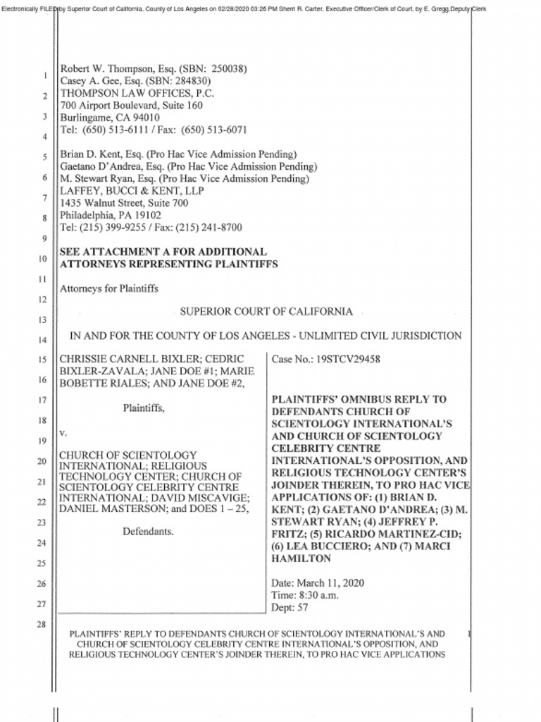 Bixler v. Scientology: Omnibus Reply To Opposition To Pro Hac Vice