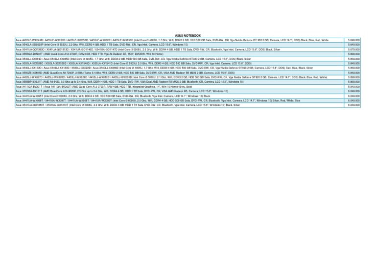 Asus A455LJ-WX027D / A455LJ-WX028D / A455LJ-WX029D / A455LJ-WX030D / A455LJ-WX031D (Intel Core i3 5010U, 2.1 Ghz, Wifi, DDR3 2 GB, HDD 500 GB Sata, DVD-RW, CR, Vga Nvidia Geforce GT920 2 GB, Camera, LCD 14.1", DOS) Black, Blue, Red, White) 5.899.000