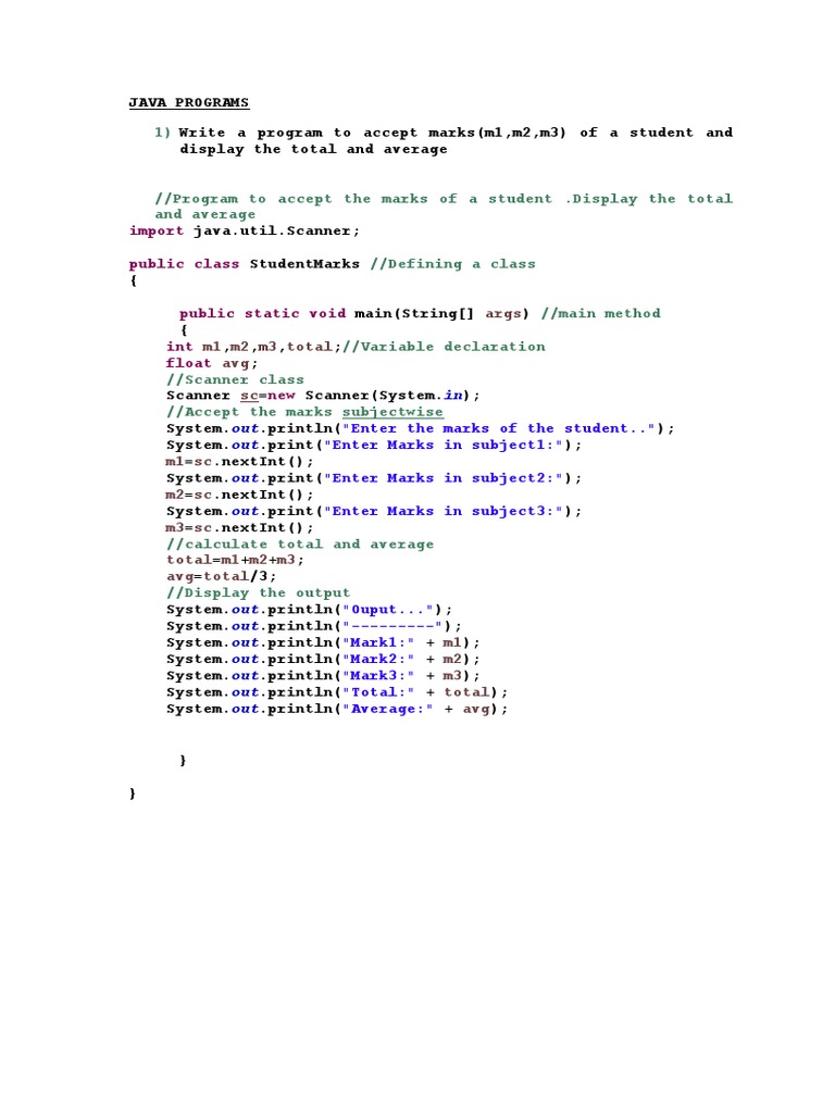 1) Write a program to accept marks(m1,m2,m3) of a student and