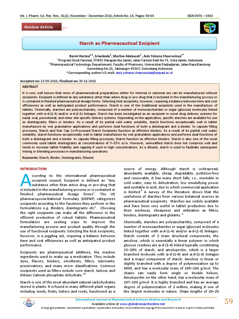 Starch has been investigated as an excipient in novel drug Binders are pharmaceutical excipients that are commonly
