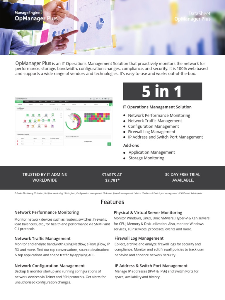 OpManager Plus is an IT Operations Management Solution that proactively monitors the network for