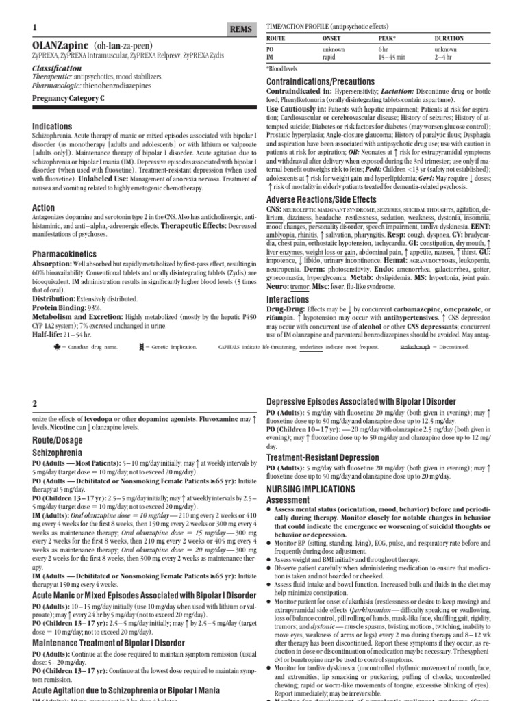 IM (Adults): Oral olanzapine dose ⫽ 10 mg/day— 210 mg every 2 weeks or 410 cally during therapy. Monitor closely for notable changes in behavior