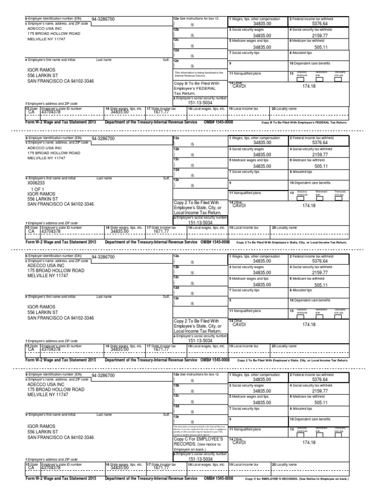 Form W-2 Wage and Tax Statement 2015 Department of the Treasury-Internal Revenue Service OMB# 1545-0008 Copy B To Be Filed With Employee’s FEDERAL Tax Return.