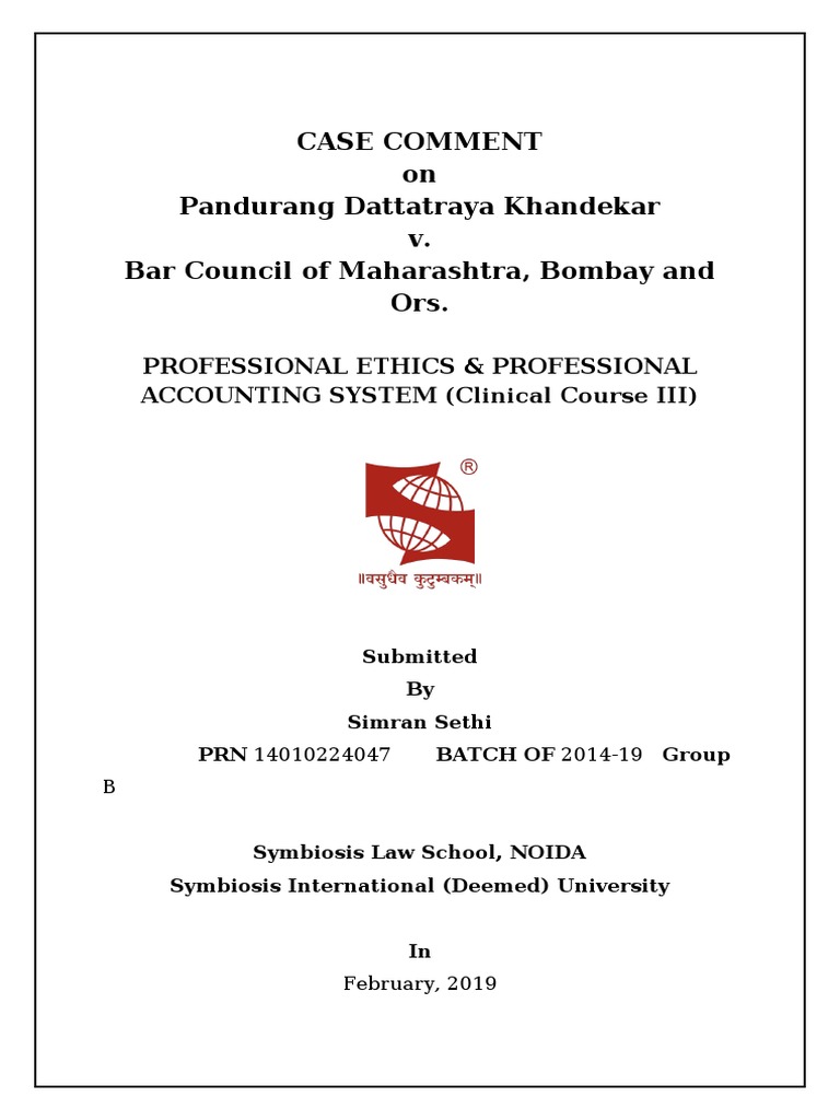 The project entitled “Case Comment: Pandurang Dattatraya KhandekarV Bar Council of