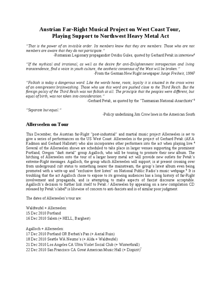 extreme-Right messages. Agalloch, the group which Allerseelen will support, is at present crossing over