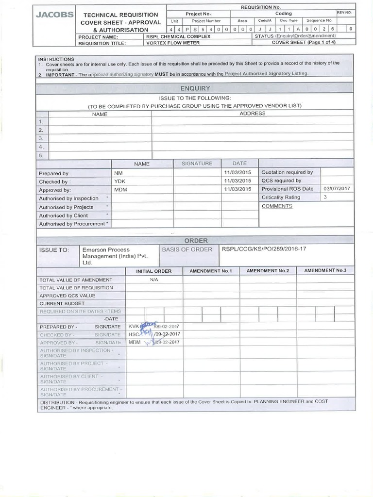 PROJECT NAME: RSPL CHEMICAL COMPLEX STATUS (Enquiry/Order/Amendment)