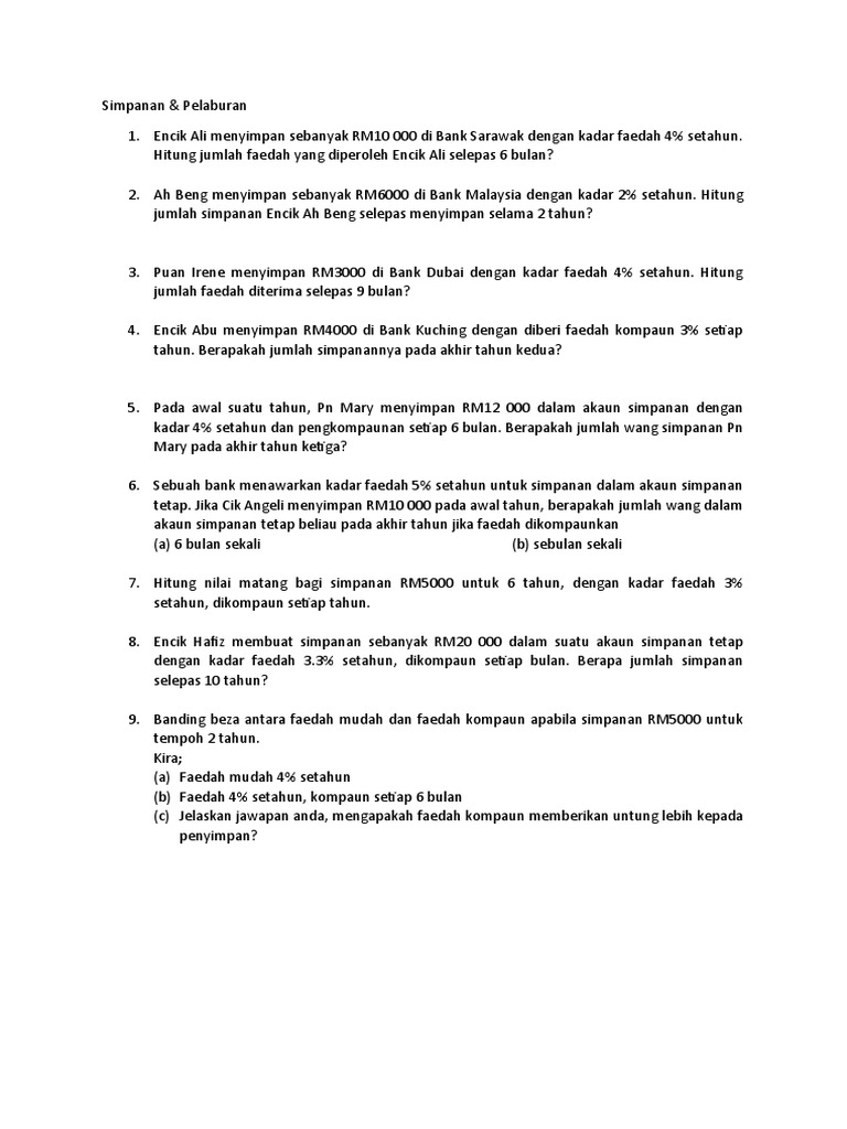 1. Encik Ali menyimpan sebanyak RM10 000 di Bank Sarawak dengan kadar faedah 4% setahun.