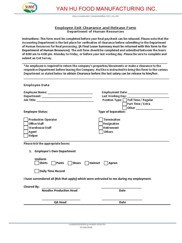 respective Department before leaving the Company. He/She is instructed to bring this form to the various