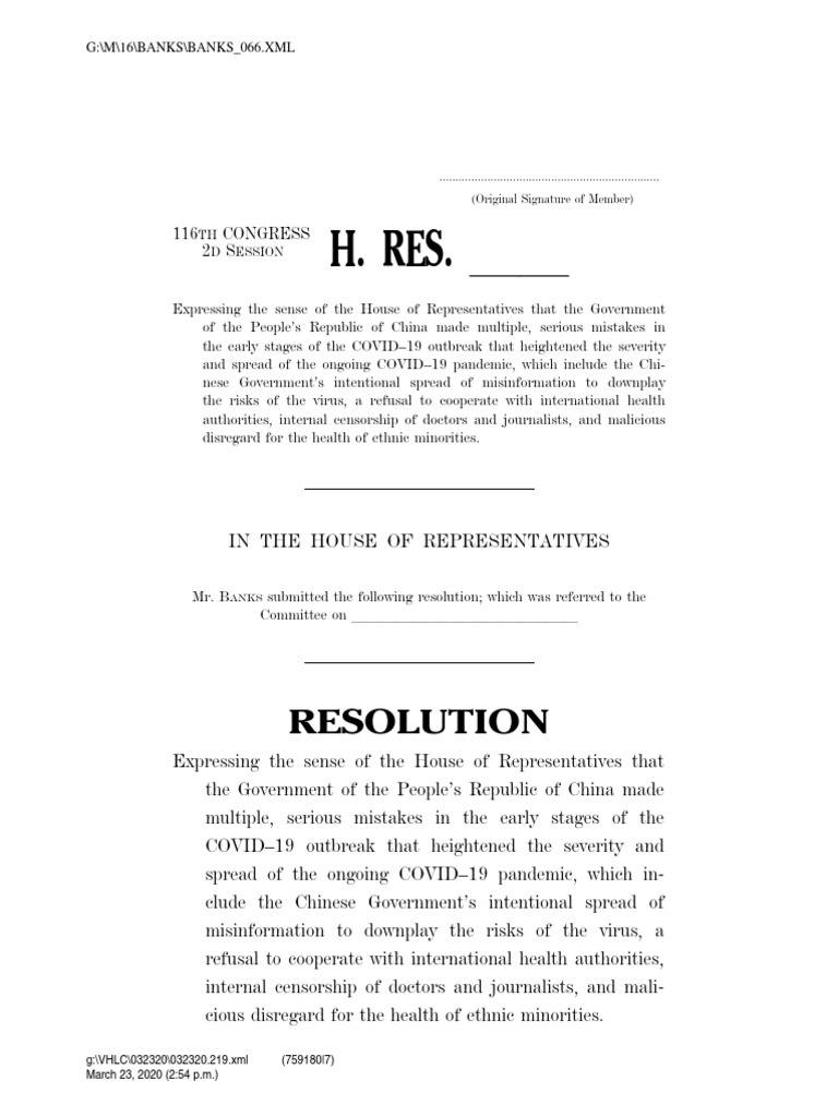 Expressing the sense of the House of Representatives that the Government of the People’s Republic of China made multiple, serious mistakes in the early stages of the COVID–19 outbreak that heightened the severity and spread of the ongoing COVID–19 pandemic, which include the Chi-nese Government’s intentional spread of misinformation to downplay the risks of the virus, a refusal to cooperate with international health authorities, internal censorship of doctors and journalists, and malicious disregard for the health of ethnic minorities.