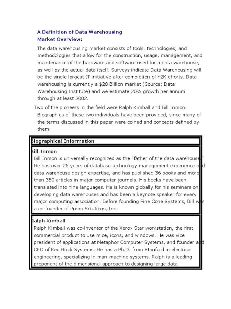 A Definition of Data Warehousing Market Overview:: Biographical Information Bill Inmon