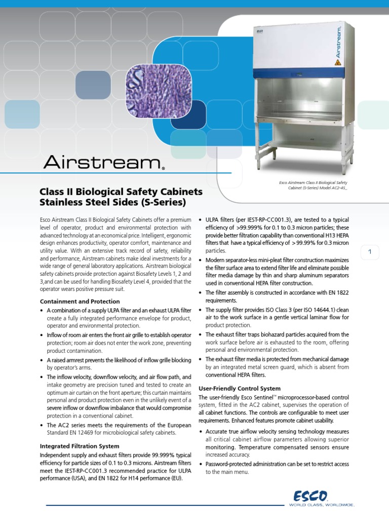 Esco Airstream Class II Biological Safety Cabinets offer a premium • ULPA filters (per IEST-RP-CC001.3), are tested to a typical