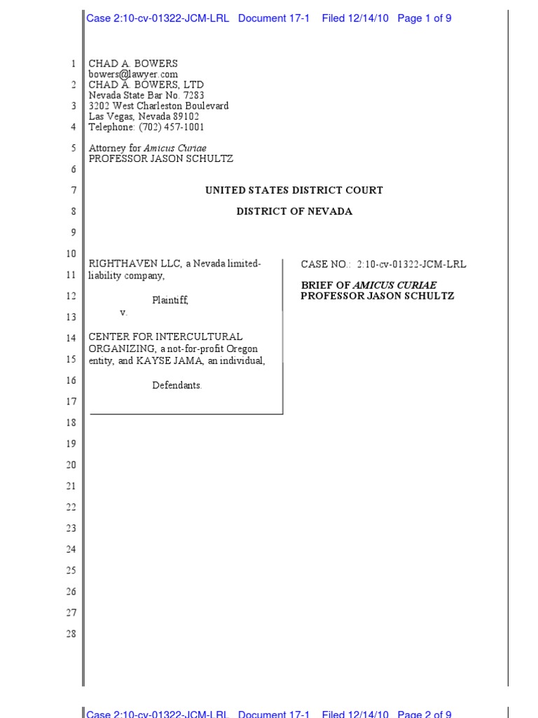 2 Righthaven sued CIO, an Oregon non-profit organization, on August 5, 2010 alleging