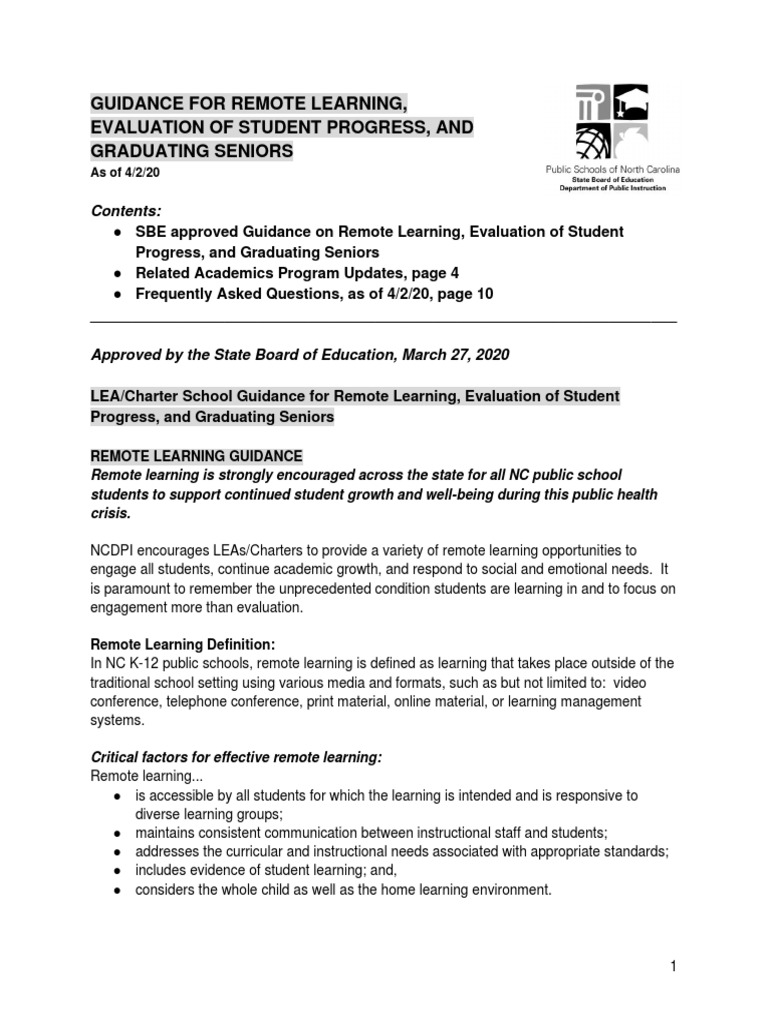 LEA/Charter School Guidance for Remote Learning, Evaluation of Student Progress, and Graduating Seniors