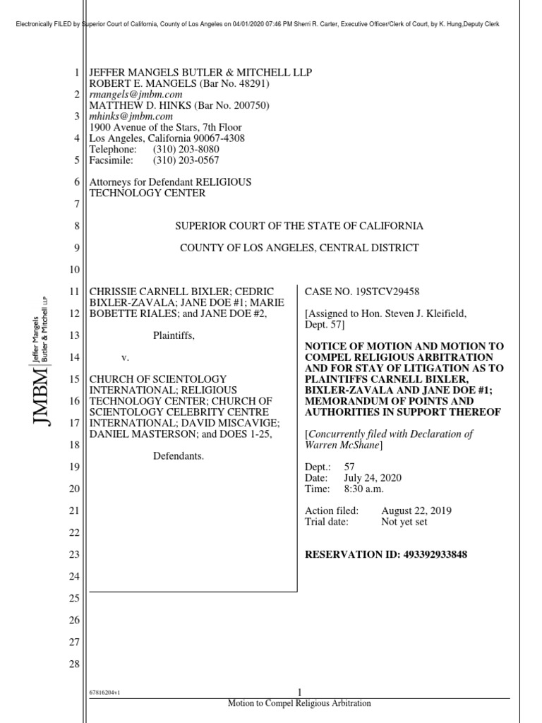 1900 Avenue of the Stars, 7th Floor Los Angeles, California 90067-4308 Telephone: (310) 203-8080 Facsimile: (310) 203-0567 Attorneys for Defendant RELIGIOUS TECHNOLOGY CENTER SUPERIOR COURT OF THE STATE OF CALIFORNIA COUNTY OF LOS ANGELES, CENTRAL DISTRICT CHRISSIE CARNELL BIXLER; CEDRIC BIXLER-ZAVALA; JANE DOE #1; MARIE BOBETTE RIALES; and JANE DOE #2, Plaintiffs, v. CHURCH OF SCIENTOLOGY INTERNATIONAL; RELIGIOUS TECHNOLOGY CENTER; CHURCH OF SCIENTOLOGY CELEBRITY CENTRE INTERNATIONAL; DAVID MISCAVIGE; DANIEL MASTERSON; and DOES 1-25, Defendants. CASE NO. 19STCV29458 [Assigned to Hon. Steven J. Kleifield, Dept. 57]