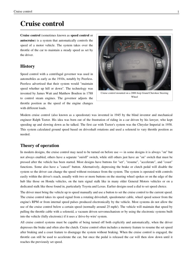 invented by James Watt and Matthew Boulton in 1788 Cruise control mounted on a 2000 Jeep Grand Cherokee Steering