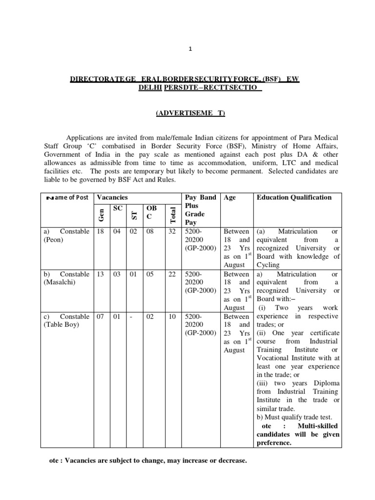 Staff Group ‘C’ combatised in Border Security Force (BSF), Ministry of Home Affairs,