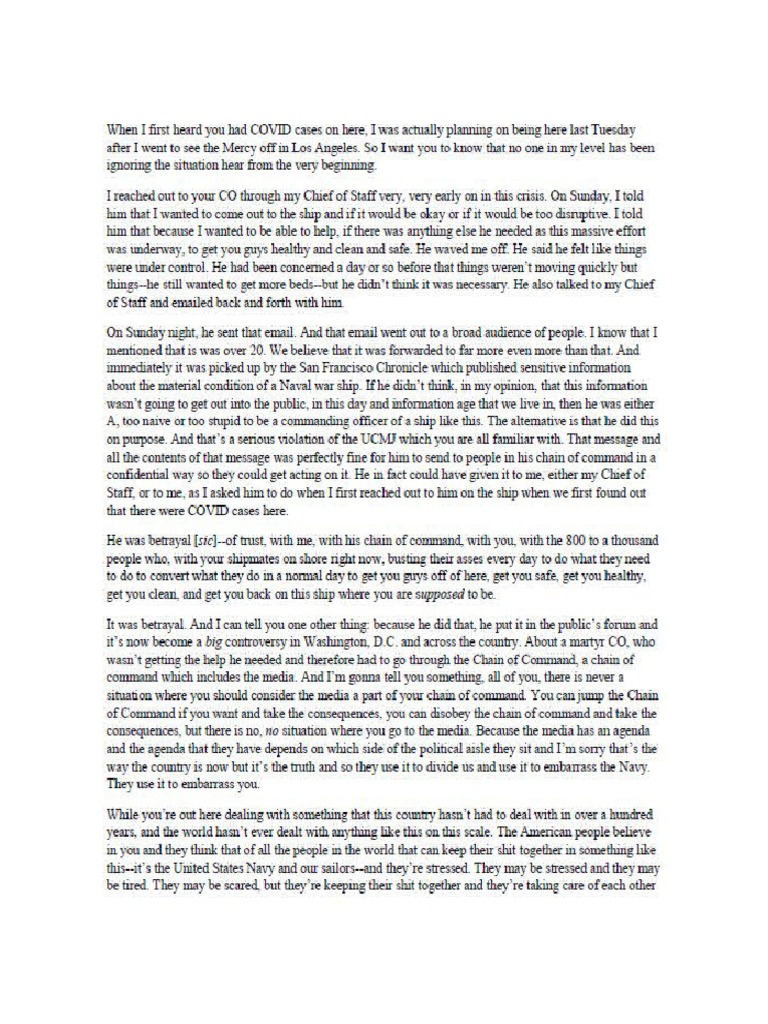 A transcript of comments reportedly delivered by Acting Navy Secretary Thomas Modly to members of the USS Theodore Roosevelt crew following the firing of Capt. Brett Crozier