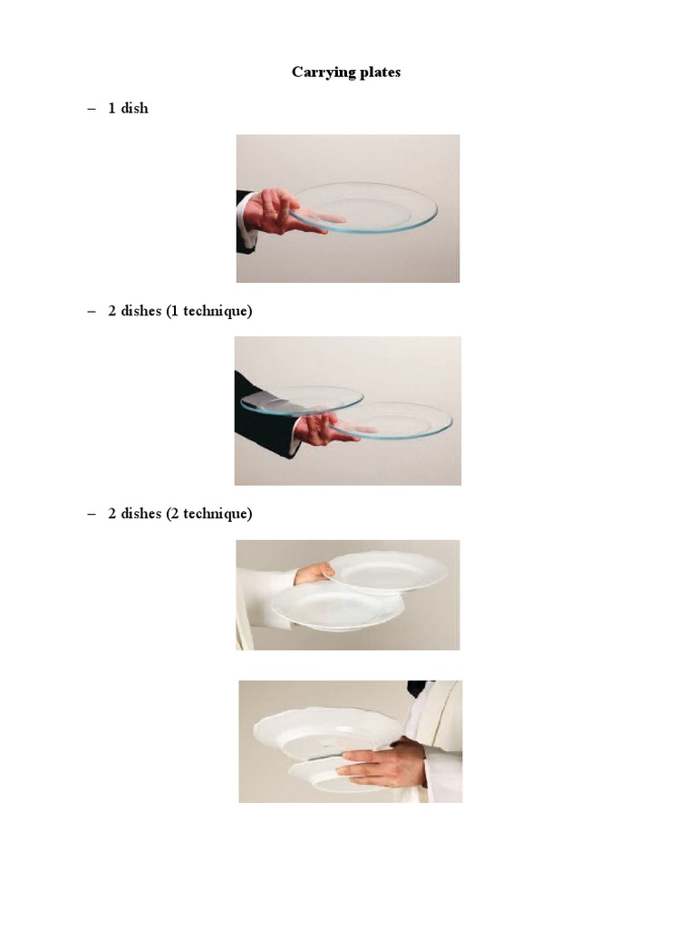 This document outlines carrying different numbers of dishes and techniques. It mentions carrying 1 dish, 2 dishes using 1 technique, 2 dishes using 2 techniques, 2 soup dishes, more empty dishes, and dishes on a tray.