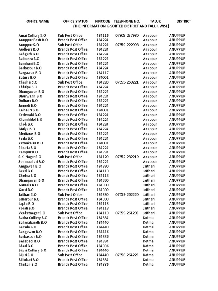 Anuppur S.O Sub Post Office 484224 07659-222008 Anuppur ANUPPUR