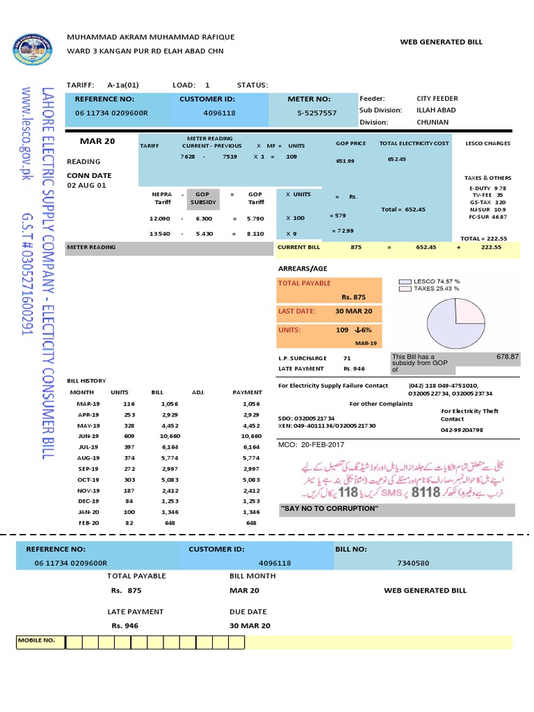 MAR 20 TARIFF CURRENT - PREVIOUS X MF = UNITS GOP PRICE TOTAL ELECTRICITY COST LESCO CHARGES