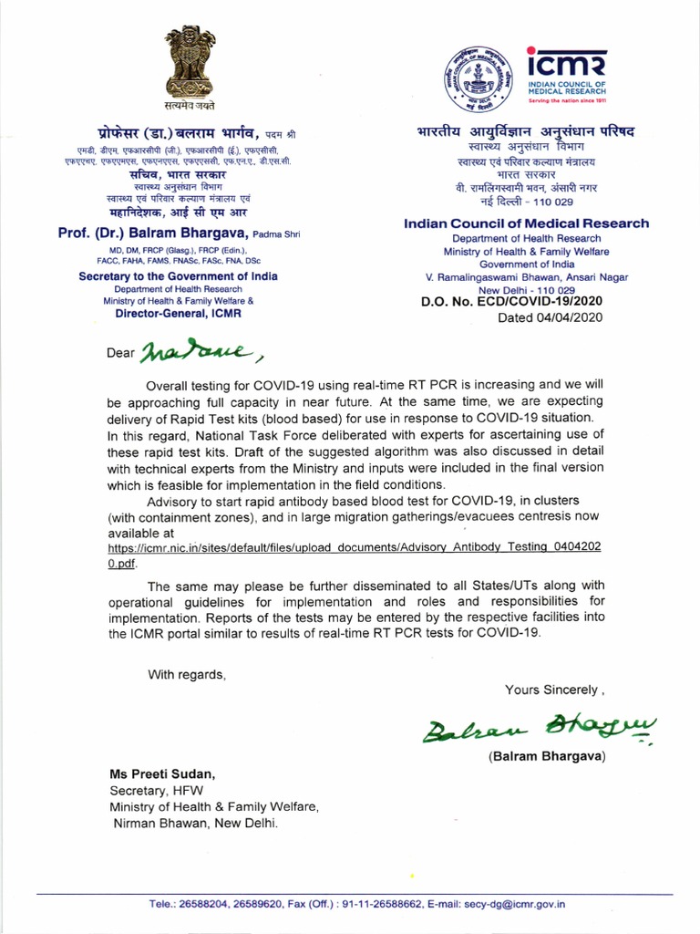 Advisory to start rapid antibody based blood test for COVID-19 (4 April 2020)