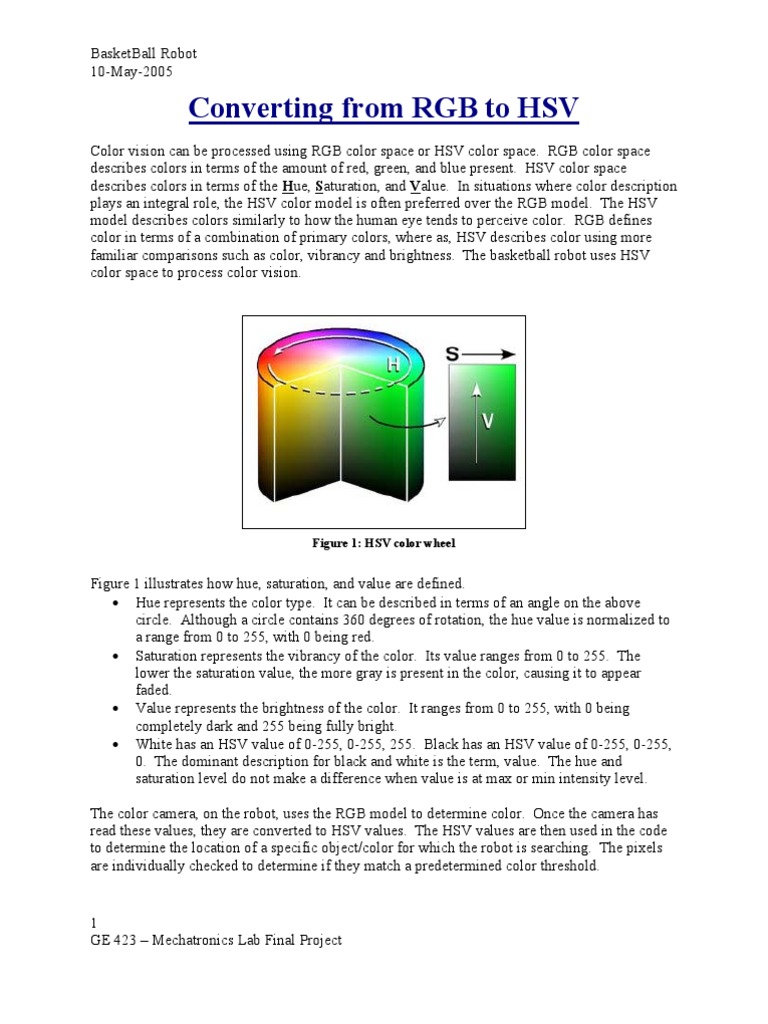 familiar comparisons such as color, vibrancy and brightness. The basketball robot uses HSV
