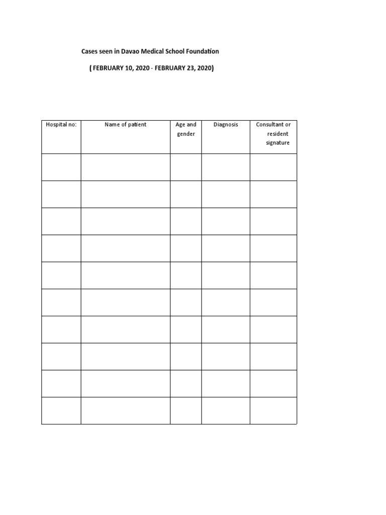 The document lists cases seen at Davao Medical School Foundation from February 10 to February 23, 2020, providing the hospital number, name of the patient, their age and gender, diagnosis, and the consultant or resident signature for each case.