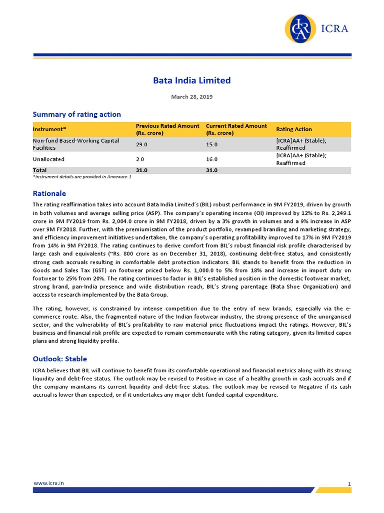 The rating reaffirmation takes into account Bata India Limited’s (BIL) robust performance in 9M FY2019, driven by growth