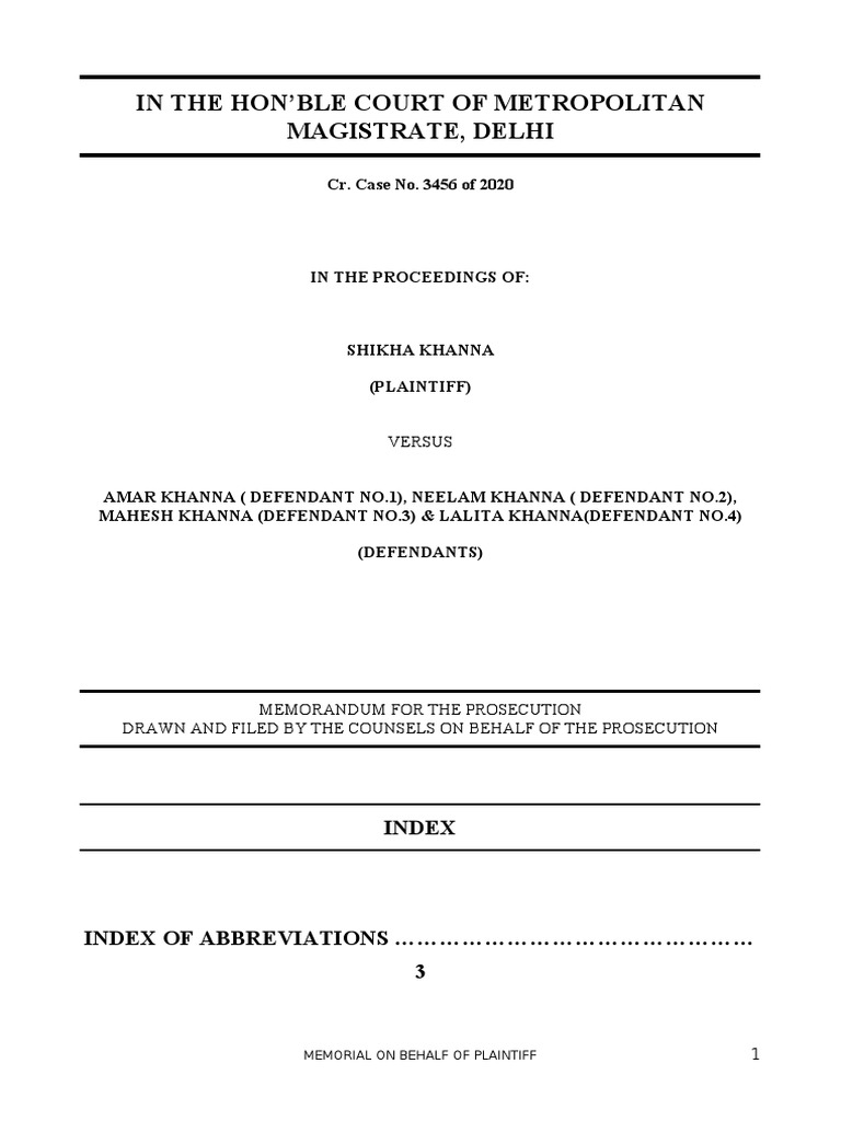 The Plaintiff humbly submits this memorandum before this Hon’ble Court under the provision of