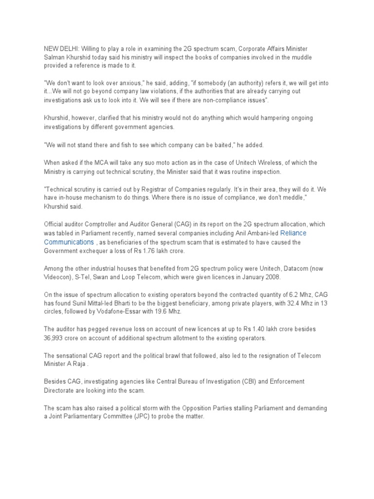 NEW DELHI: Willing to play a role in examining the 2G spectrum scam, Corporate Affairs Minister