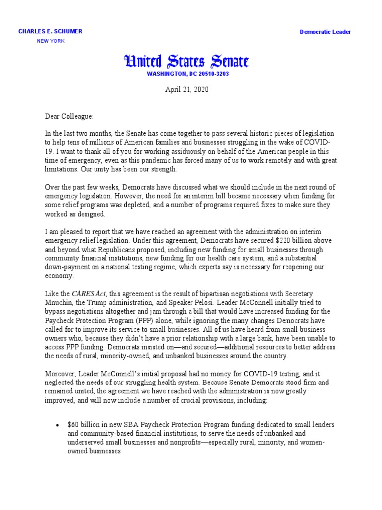In the last two months, the Senate has come together to pass several historic pieces of legislation to help tens of millions of American families and businesses struggling in the wake of COVID-19.I want to thank all of you for working assiduously on behalf of the American people in thistime of emergency, even as this pandemic has forced many of us to work remotely and with greatlimitations. Our unity has been our strength.Over the past few weeks, Democrats have discussed what we should include in the next round of emergency legislation. However, the need for an interim bill became necessary when funding for some relief programs was depleted, and a number of programs required fixes to make sure they worked as designed. I am pleased to report that we have reached an agreement with the administration on interim emergency relief legislation. Under this agreement, Democrats have secured $220 billion above and beyond what Republicans proposed, including new funding for small businesses through community financial institutions, new funding for our health care system, and a substantial down-payment on a national testing regime, which experts say is necessary for reopening our economy. Like the