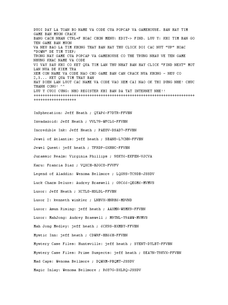 DUOI DAY LA TOAN BO NAME VA CODE CUA POPCAP VA GAMEHOUSE.