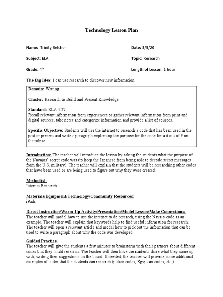 The teacher will model how to use the internet to do research, using the Navajo code as an