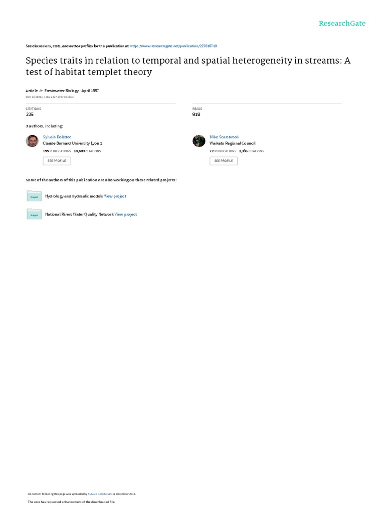 Statzner B., Resh V.H. & Dolédec S (eds) (1994) Ecology MSc thesis, University of Auckland, Auckland,