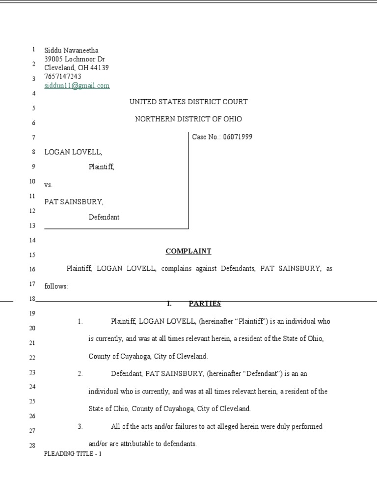 16 Plaintiff, LOGAN LOVELL, complains against Defendants, PAT SAINSBURY, as