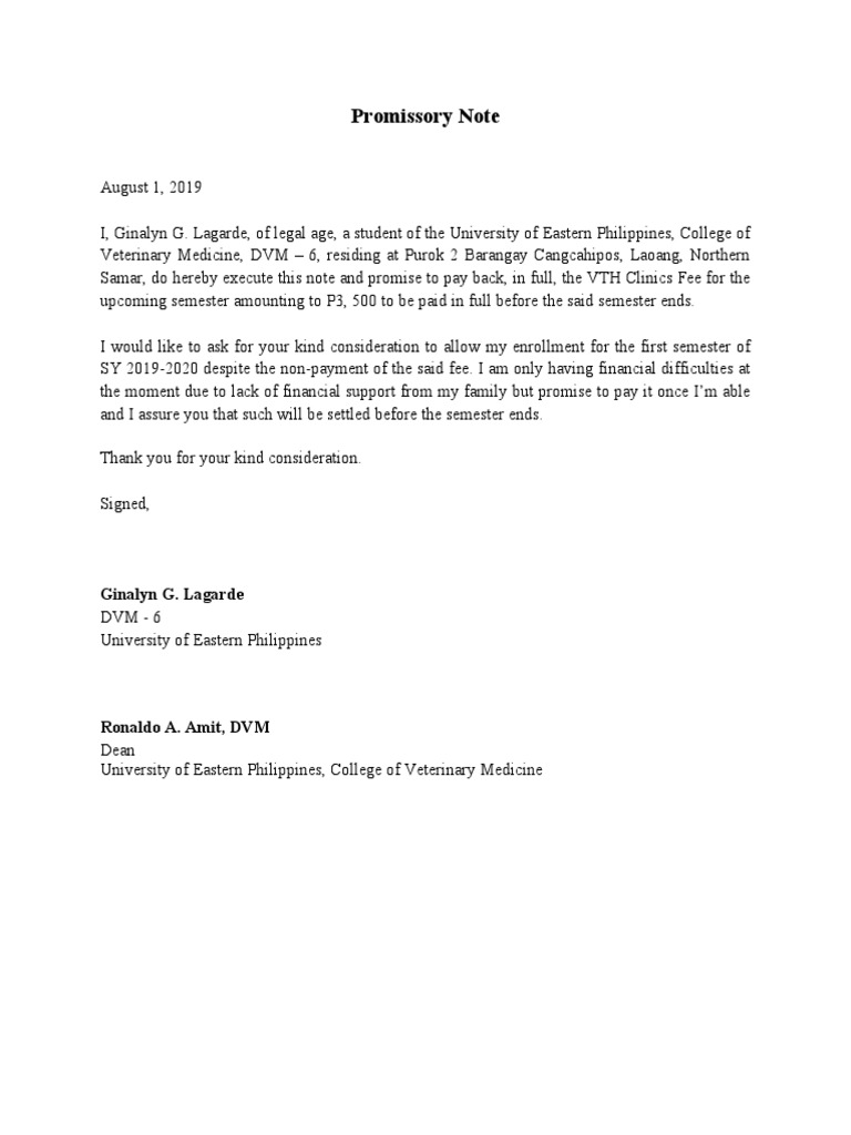 Samar, do hereby execute this note and promise to pay back, in full, the VTH Clinics Fee for the