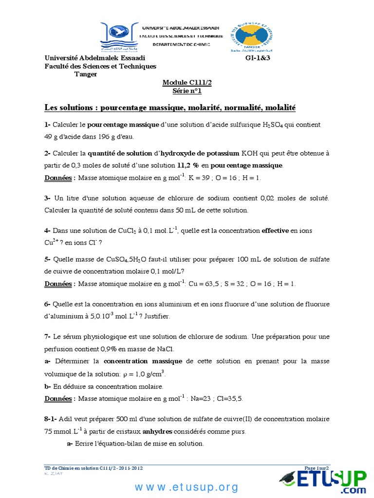 TD 1 avec corrigé de chimie des solutions Visitez le site : https://www.etusup.org