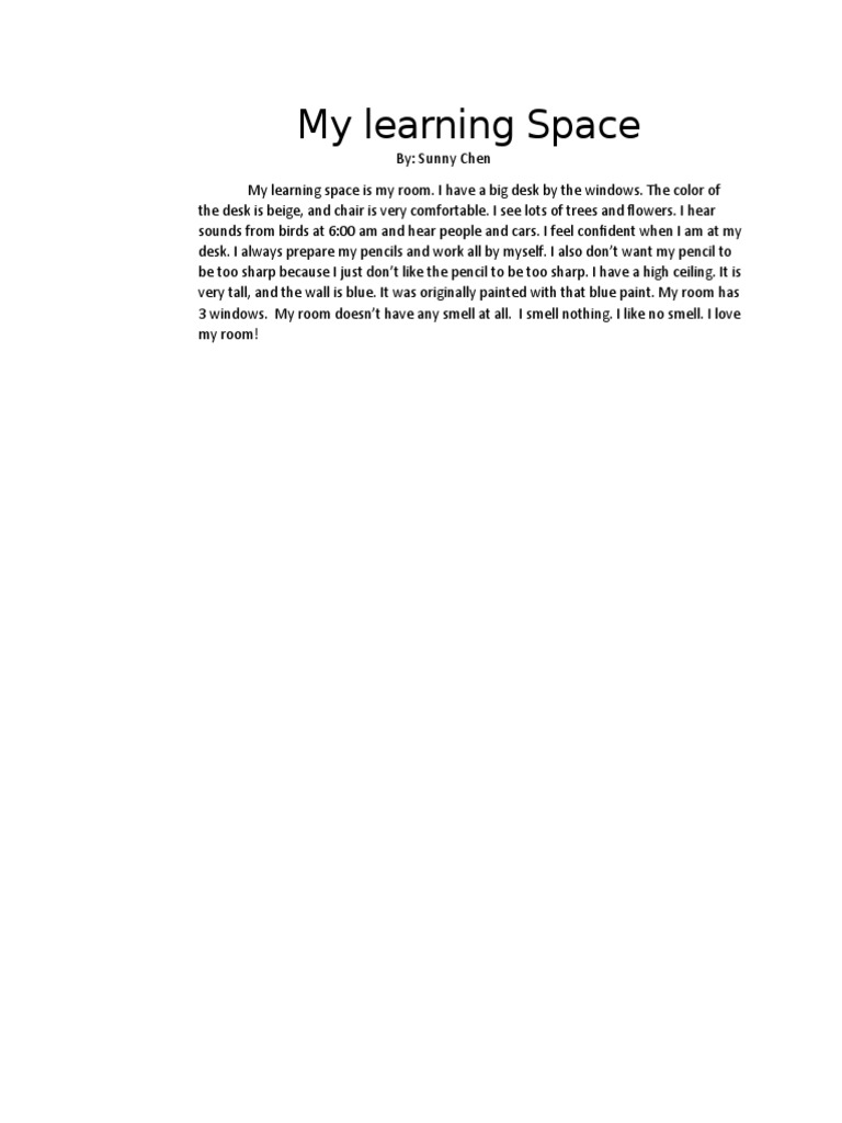 Sunny Chen describes their learning space as their bedroom, which has a beige desk by the window overlooking trees and flowers. They feel confident sitting at their tall desk under the high blue ceiling, preparing their pencils to do work alone while listening to birds in the morning and people outside. Their room has no noticeable smells and three windows.