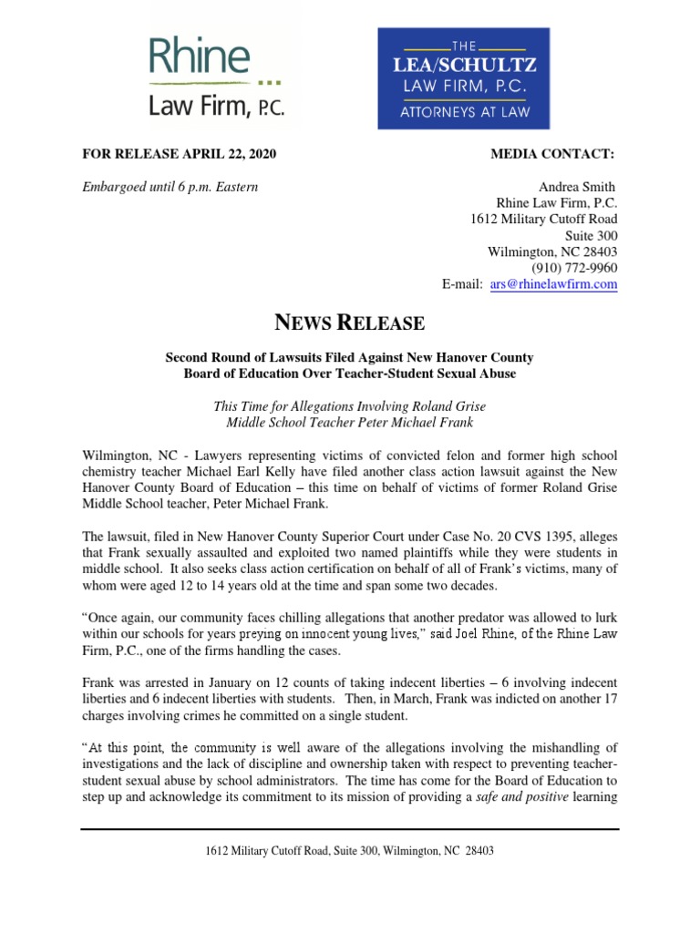 2020-0422 RHINE LAW FIRM News Release on Frank Complaint Against New Hanover County Schools 4.22.2020