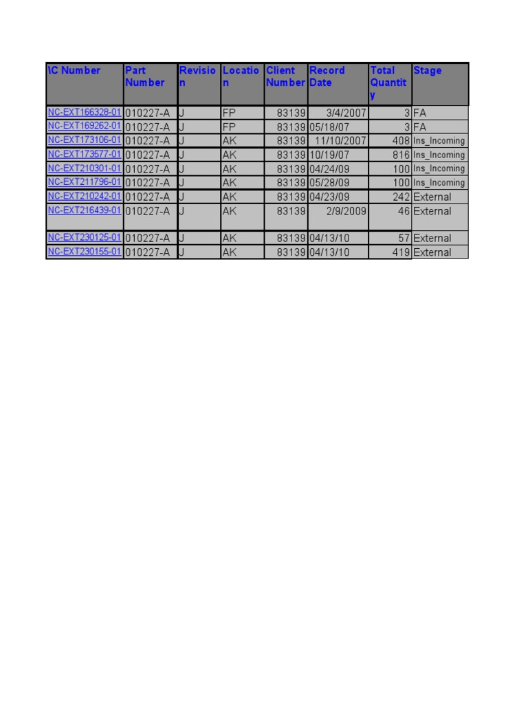 NC Number Part Number Revisio Locatio Client Record Total Stage
