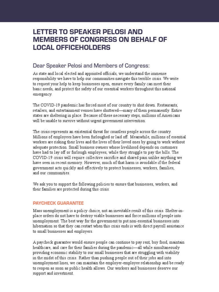 As state and local elected and appointed ocials, we understand the immense responsibility we have to help our communities navigate this terrible crisis. We write to request your help to keep businesses open, ensure every family can meet their basic needs, and protect the safety of our essential workers throughout this national emergency. The COVID-19 pandemic has forced most of our country to shut down. Restaurants, retailers, and entertainment venues have shuttered—many of them permanently. Entire states are sheltering in place. Because of these necessary steps, millions of Americans will be unable to survive without urgent government intervention. The crisis represents an existential threat for countless people across the country. Millions of employees have been furloughed or laid o. Meanwhile, millions of essential workers are risking their lives and the lives of their loved ones by going to work without adequate protection. Small business owners whose livelihood depends on customers have had to lay o or furlough employees, while they struggle to pay the bills. The COVID-19 crisis will require collective sacrice and shared pain unlike anything we have seen in recent memory. However, much of that harm is avoidable if the federal government acts quickly and eectively to protect businesses, workers, families, and our communities.We ask you to support the following policies to ensure that businesses, workers, and their families are protected during this crisis: