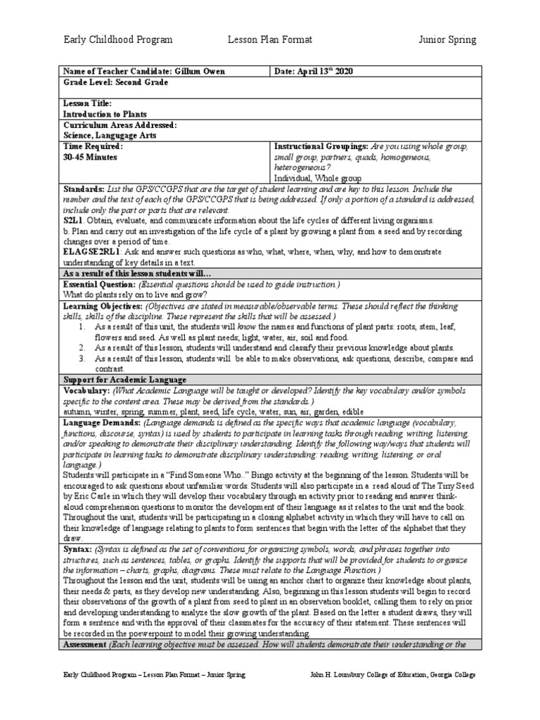 Early Childhood Program – Lesson Plan Format – Junior Spring John H. Lounsbury College of Education, Georgia College
