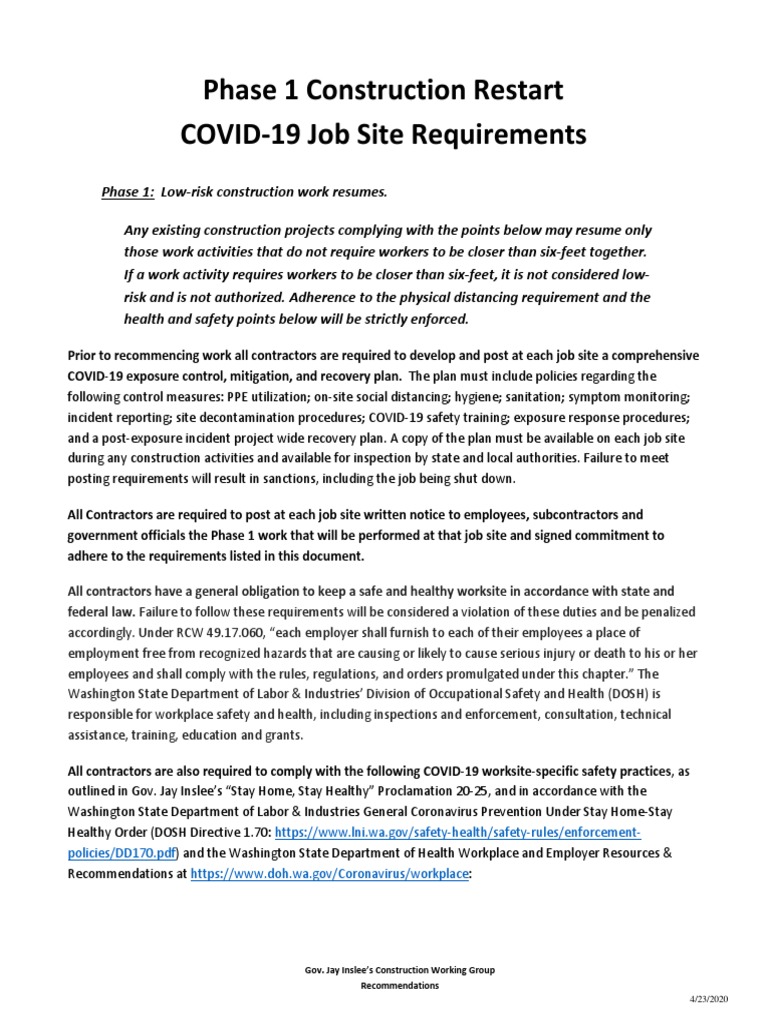 Phase 1 Construction Restart COVID-19 Job Site Requirements
