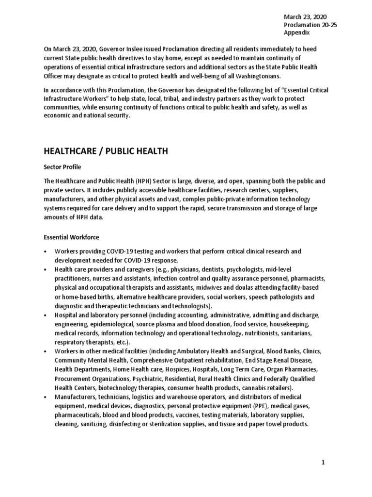 March 23, 2020 Proclamation 20-25 Appendix 1 On March 23, 2020, Governor Inslee issued Proclamation directing all residents immediately to heed current State public health directives to stay home, except as needed to maintain continuity of operations of essential critical infrastructure sectors and additional sectors as the State Public Health Officer may designate as critical to protect health and well-being of all Washingtonians. In accordance with this Proclamation, the Governor has designated the following list of “Essential Critical Infrastructure Workers” to help state, local, tribal, and industry partners as they work to protect communities, while ensuring continuity of functions critical to public health and safety, as well as economic and national security.