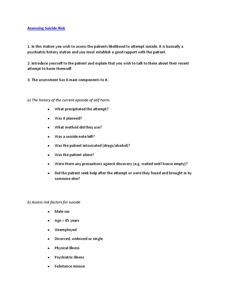 1. In this station you wish to assess the patients likelihood to attempt suicide. It is basically a