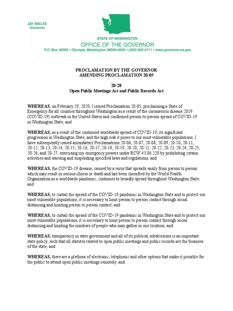 PROCLAMATION BY THE GOVERNOR AMENDING PROCLAMATION 20-05 20-28 Open Public Meetings Act and Public Records Act WHEREAS