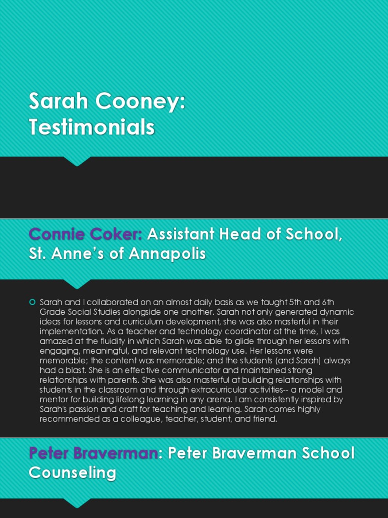 Sarah Cooney and I worked together — I was her principal — from 2011 to 2015. Sarah's
