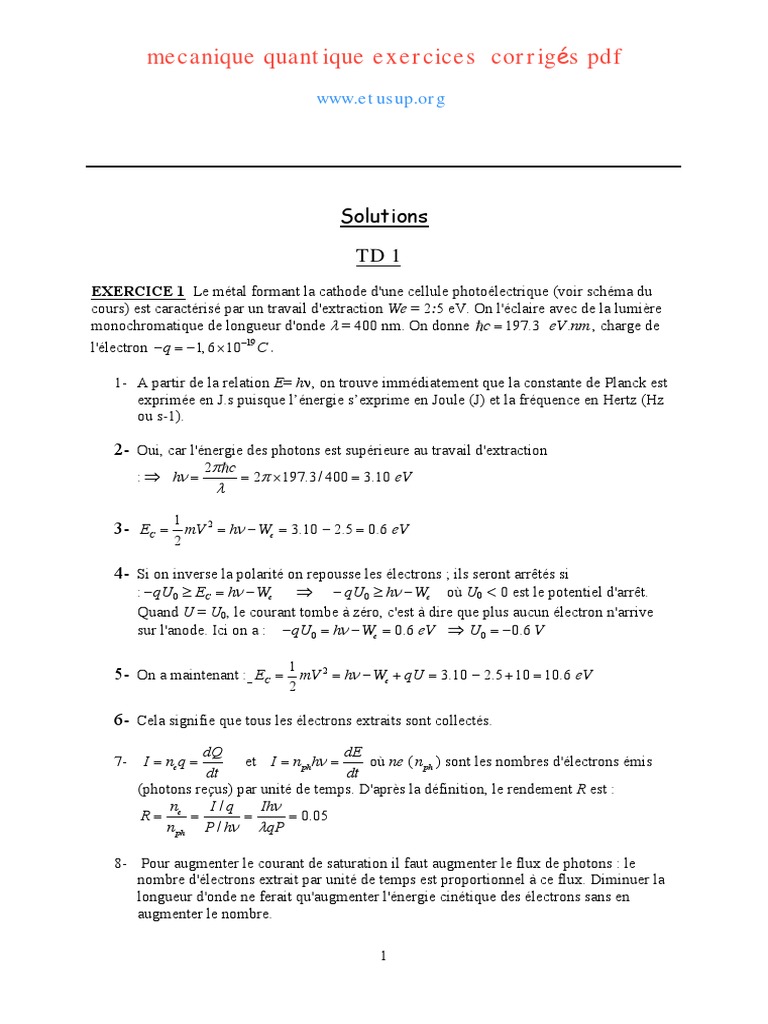 mecanique quantique exercices corrigés pdf (TD 1) najib