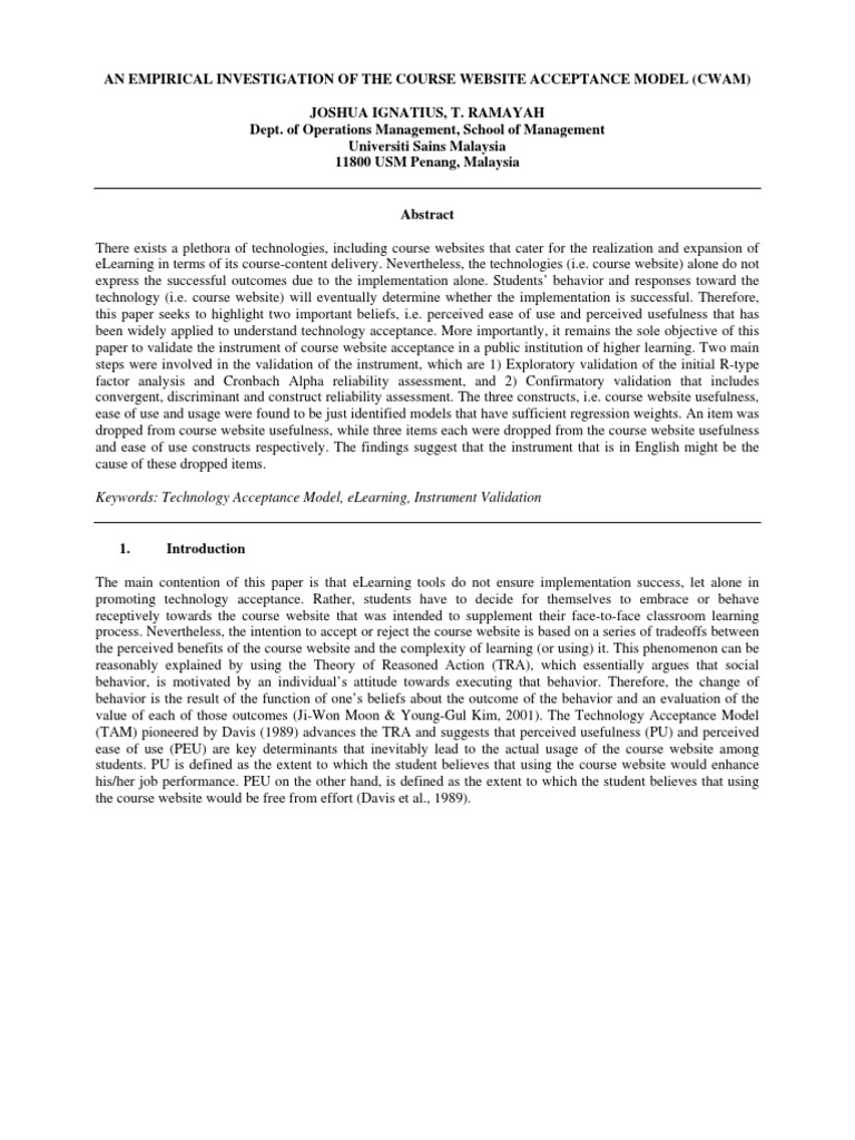 paper to validate the instrument of course website acceptance in a public institution of higher learning. Two main
